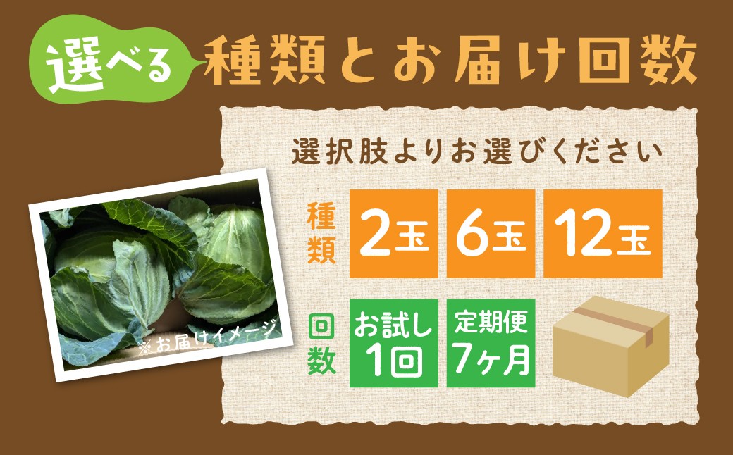 | 容量 | 旬のキャベツ 【選べる本数】 ・2玉 ・6玉 ・12玉 【お届け回数】 ・1回 ・7回定期便(11~5月) |