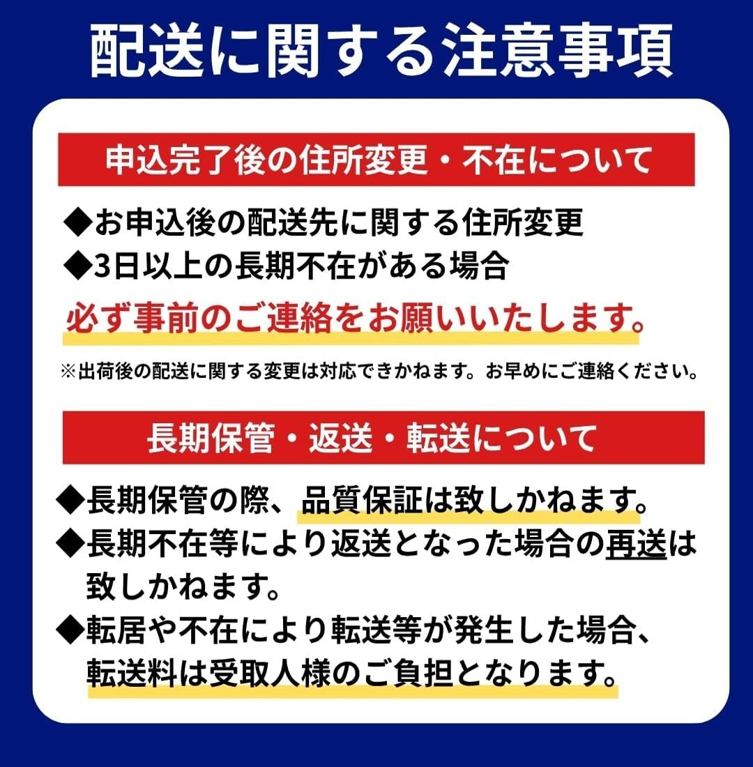 ●発送時期/11月~3月を予定しております。 ※お届け期間は生育状況により多少の変動がある場合がございます。 ≪お届け時期の一例≫ 例1)5月にお申込みの場合 └ 1回目:11月/2回目:12月/3回目:1月・・・ 例2)1月にお申込みの場合 └ 1回目:2月/2回目:3月/3回目:11月・・・ ※翌シーズンにまたがりお届けとなる場合がございます。 ※ご寄附のタイミングにより、初回お届けが当月になる場合もございます。 |