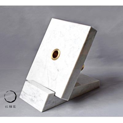 大理石は、その光沢の美しさや高級感から、より上質な空間を追求する人々から選ばれ、愛されてきました。天然石のため、同じ色合いや模様は二つとして存在せず、一点一点が、違った顔を持つ花器となります。光のあたる角度によっても様々な表情を見せてくれ、その石の持つ表情によって、花の生け方さえも変わってくるかも知れません。また、石は見た目以上に重みのあるもの。安全性に配慮し、花器自体は動かさずに真鍮の筒の着によって花を替えられる造りにしました。時を重ねるほどに風合いが変わる経年変化も、真鍮特有の魅力です。ワイヤーボールもお付けしておりますので1~2輪生けていただく際にお役立て下さい。「石翔花」を手にしてくださった方、それぞれ“石”と“花”の出会いをお楽しみいただけたら幸いです。