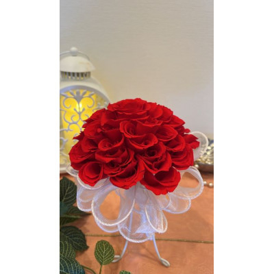 プリザーブドフラワーを使用し、一つ一つ丁寧に作っています。場所を気にせずに飾りやすく、様々なギフト、新築祝いや開店祝いにも人気です。