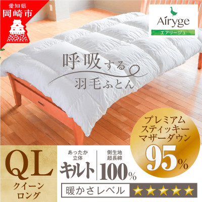 岡崎市創業94余年の寝具店三代目がどうしても実現したかった羽毛ふとんが「Airyge(エアリージュ)」です。 羽毛の買い付け~生地の縫製まで全てにこだわった至極の羽毛ふとんです。 ーエアリージュが安心・安全な理由ー (1)羽毛について 羽毛の産地から原料羽毛を直接便で日本の製造工場へ入り、徹底した洗浄を行った羽毛を仕入れる (2)生地について 羽毛を包む側生地は、選び抜いた糸・織りのものを採用する (3)吹き込み・縫製について 技術が確保された国内工場にて、側生地縫製を行う 羽毛を最大限に活かす立体キルト加工を行う ・冬にこちらの羽毛ふとん1枚で寝ていただくことのできる、あたたかさレベル星4つです。 従来の羽毛ふとんは、ボリュームがあり保温力があればあるほど良くて高品質とされており、羽毛ふとんの魅力である軽さは追求されていませんでした。 「Airyge」が目指しているのは、軽くて蒸れにくい上に、あなたに合う機能を持っている羽毛ふとんなのです。 ◆メンテナンス 普段のお手入れとして直射日光を避け、定期的に干してください 使用後5年ほどでクリーニングをお勧めします 使用後10年ほどで一度リフォームをご検討ください ■生産者の声 マザーグース(母鳥)を使用しているため通常のグースに比べ、ダウンボールが大きく 保温力も倍増します。そのため、充填綾が多くない場合でも軽く、あたたかさをキープすることができます。 あなたが必要としている羽毛ふとんは一人一人によって違います。 「暑がりだから薄いほうが良い」「空調で室温を整えるから、保温力よりも軽さを重視したい」などなど、それぞれ違った特徴の羽毛ふとんが必要となります。 そのためには、羽毛の原料や側生地の確保など、細かい要求に応えてくれる国内工場の協力が必要でしたが、幸いにも先人たちから引き継がせていただいた人と人との信頼関係がありましたので「Airyge」は実現できたのです。 ■注意事項/その他 ※画像はイメージです。 ※画像製品サイズはシングルサイズです。