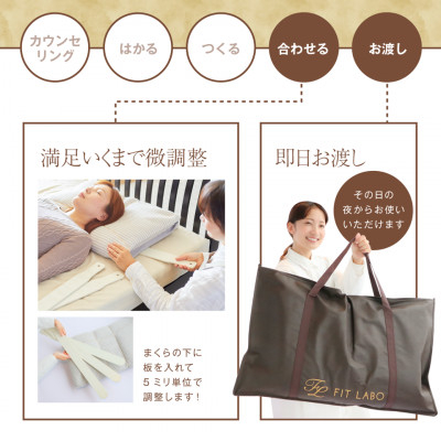 オーダーメイド枕を始めて25年の蓄積とノウハウを持つ小野ふとん店によるオーダー枕です。 オーダー枕専用測定機を使い、立位姿勢を背面と側面の2方向から測定し、あなたの体に合ったまくらをお作りします。 肩や首のハリ、いびきなどでお悩みの方も是非お試し下さい。 【寄付お申し込み後の流れ】 1.FITLABOオリジナルギフトカードをお送り致します。 2.ギフトカードを小野ふとん店に持ってご来店下さい。 3.お使いの寝具、寝姿勢、寝室環境についてカウンセリング致します。 4.西川開発のオーダーメイド枕専用測定機で体の凹凸などを測定しオリジナル枕をお作り致します。 5.お作りした枕で実際に寝てもらい高さを微調整致します。 6.微調整後、10年間無料調整カードと一緒にお持ち帰り頂けます。 ※ ギフトカードの有効期限はチケット発行日から1年間です。 ※ 10年間無料調整は全国のFITLABO加盟店でご利用頂けます。 ■生産者の声 あなたの体の不調がオーダーメイド枕によって軽減されるかも・・・このオーダーメイド枕の良さは、10年間の無料調整が保障されている事です。 もし、体型が変化しても全国のFITLABO加盟店で無料で微調整いただけます。是非お試し下さい。 ■注意事項/その他 ギフトカードをご持参の上、店頭へお越しくださいませ。 その場で計測、その日にお持ち帰り可能です。 ・予約不要ですが、事前にご連絡いただくとお待たせすることなく対応が可能となります。 ※画像はイメージです。