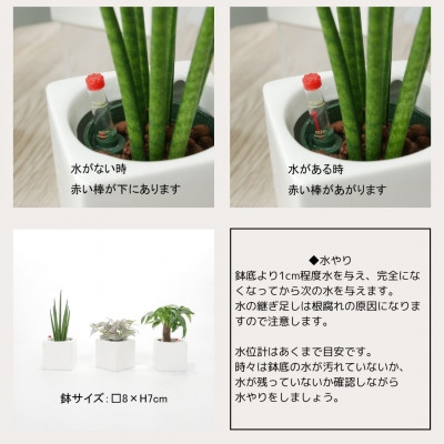 育てやすい観葉植物です。 ◆品種 1~12の中かからオススメの観葉植物をお届けいたします。 1 シェフレラ 2 クロトン 3 パキラ 4 コルジリネ 5 ポトス 6 ペペロミア 7 ドラセナ・コンパクタ 8 サンセベリア 棒タイプ 9 トラディスカンチア 10 ヘデラ 11 ピレア 12 サンセベリア・ハイブリッド ※画像と異なる色違いでの植物でのお届けの場合もございます。予めご了承ください。◆植え込み材料 ハイドロコーン ハイドロコーンは粘土に空気を含ませて焼き上げた発砲煉石です。 清潔で何度でも使え保水性、通気性に優れた栽培用土です。 ◆材質/大きさ 鉢材質:陶器 鉢サイズ:□8×H7cm 植物を含む大きさ:約W6~25×H15~23cm ※植物により大きさや樹形は異なります。◆水やり 鉢底より1cm程度水を与え、完全になくなってから次の水を与えます。 水の継ぎ足しは根腐れの原因になりますので注意します。 こちらの商品は水位計付きです。 水がなくなると赤い棒が下に下がります。 水やりは赤い棒が水位計の真ん中になるぐらい水を入れます。 水位計はあくまで目安です。 時々は鉢底の水が汚れていないか、水が残っていないか確認しながら水やりをしましょう。 ◆管理方法 直射日光を避け、レースのカーテン越し程度の光のある、風通しの良い場所に置いてください。 冷暖房の風が直接当たらないように注意します。 冬場は10℃以上を保てる場所にしましょう。 霧吹き等で定期的に葉水を与えましょう。 ■生産者の声 新鮮な植物を農場から直接お届けいたします! 緑のある暮らしを始めませんか? ■注意事項/その他 冬季の寒波など天候により出荷日を変更させていただく場合がございます。 到着後はすぐに開封してください。 ※画像はイメージです。撮影小物はお届け品ではございません。 ※1~12のうち選択はできません。 お礼品の特性上、暑さ・寒さが厳しい地域へお届けの際は、 お礼品の品質を維持できないことがございます。あらかじめご了承ください。