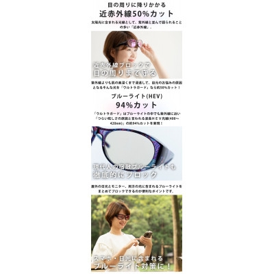 | 消費期限 | UVカット率は驚異の99.99%超! 太陽光に含まれる光線として有名な紫外線(UV)。 紫外線は人体に対する影響が強く、肌だけでなく目にも多くの紫外線が当たっています。 驚異のUVカット率99.99%超! 東海光学の独自開発レンズ「ウルトラガード」は特殊なレンズコーティングにより 約99.99%のUVカット率! かけるだけで目やその周辺を紫外線から徹底ガードします。 目の周りに降りかかる近赤外線50%カット 太陽光に含まれる光線として、紫外線と並んで語られることの多い「近赤外線」。 近赤外線ブロックで目の周りまで守る 紫外線(UV)よりも肌の奥深くまで浸透して、目元のお悩みの原因となる そんな光を「ウルトラガード」なら約50%カット! ブルーライト(HEV)94%カット 「ウルトラガード」はブルーライトの中でも紫外線に近い 「つらい眩しさの原因と言われる波長HEV光線(400~420nm)」の約94%カットを実現! 現代人の宿敵ブルーライトも徹底的にブロック 屋外の日光とモニター、両方の光に含まれるブルーライトを まとめてブロックできるのが便利なポイントです。 スマホ・日光に含まれるブルーライト対策に! 幅広いスタイルに使えるオーバーグラスタイプ 「ウルトラガード オーバーグラス」は 眼鏡の上からの装着を想定して設計されたフレームデザインが大きな特徴。 メガネの上からでも快適な掛け心地を実現。 眼鏡をかけた状態での行楽やスポーツ さらに車の運転など様々なシーンにさっとかけるだけで 「目の光対策」ができる手軽さを実現しました。 自転車・行楽・農作業など日光が気になる様々な場面に かけるだけサポート!! 軽量なのに強い36gのポリカーボネート製 行楽やスポーツなど、屋外で使用するアイテムだからこそ 「ウルトラガード オーバーグラス」は大きめ設計なのに重量はわずか36g! ライトなかけ心地の軽量性能を実現 持ち運びにうれしいコンパクトケース付 お送りする「ウルトラガード オーバーグラス」は全て驚くほどコンパクトに折りたたみが可能な 専用ケース&眼鏡クロスが付属! 厚さ1.5cmに折り畳めるコンパクトデザイン! |