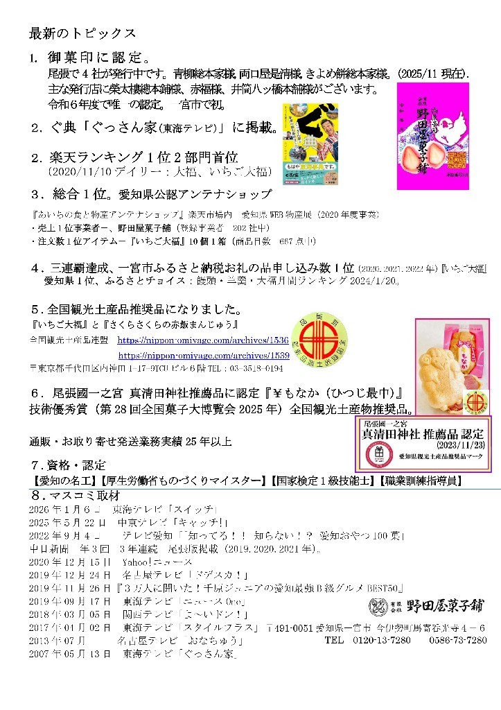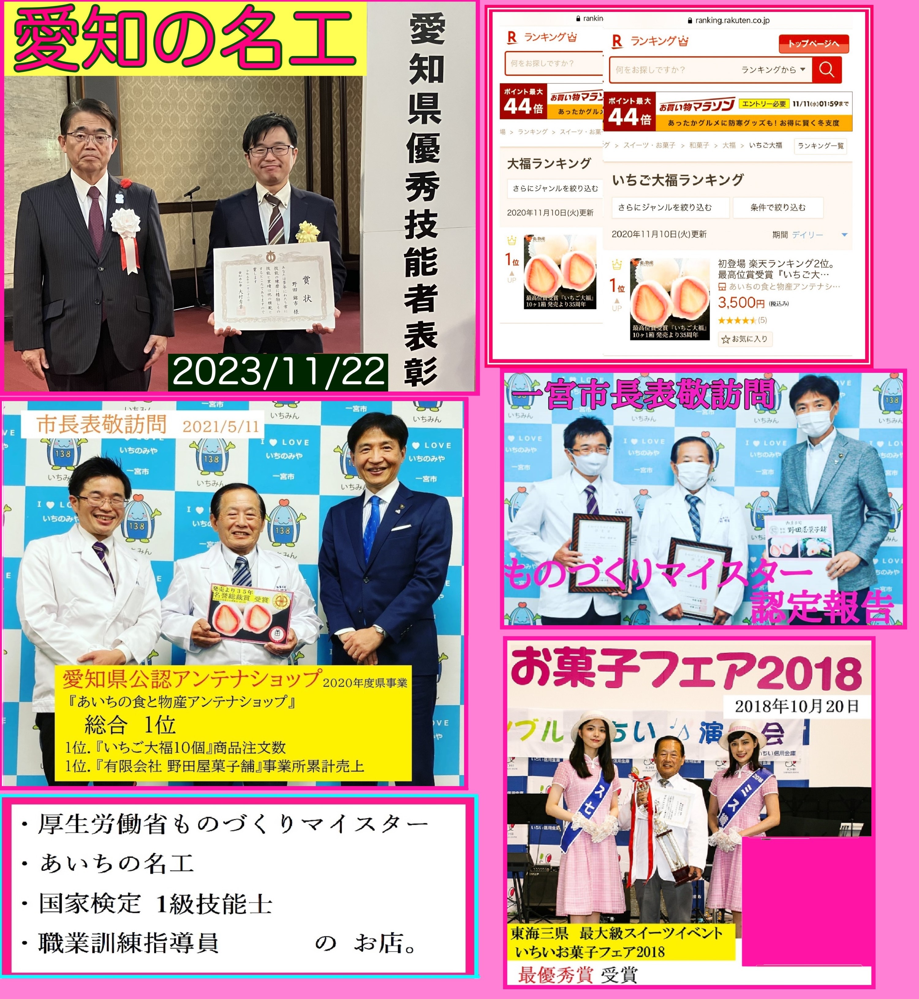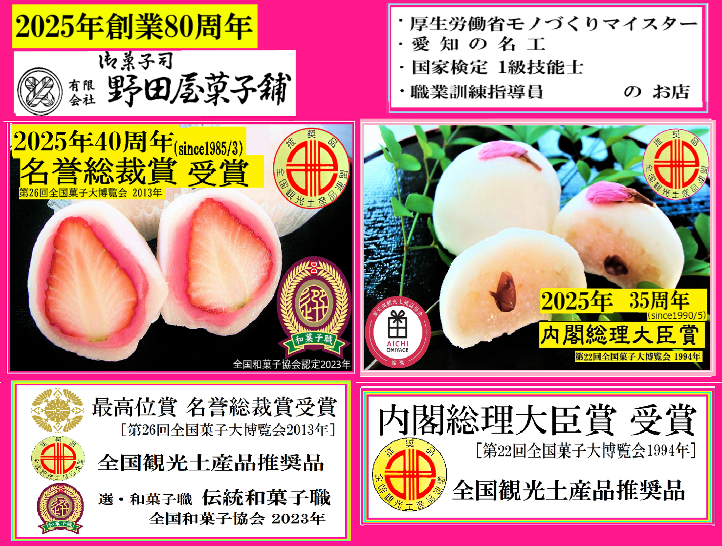 最高位賞 名誉総裁賞『いちご大福』 1985年3月発売 伝統和菓子職認定(全国和菓子協会2023年) 全国観光土産品推奨品 内閣総理大臣賞『さくらさくらの赤飯まんじゅう』 1990年5月発売 全国観光土産品推奨品 ふるさと納税返礼品 愛知県1位 饅頭・羊羹・大福ランキング月間(ふるさとチョイス2024/1) 3連覇達成一宮市1位 申込数2020-22年 【厚生労働省ものづくりマイスター】 【あいちの名工】のお店。 ※配達日当日にお召し上がりいただきたい商品につき、事前に配達日時の打合せでご連絡させていただきます。 ※沖縄・北海道・離島などチルド輸送の不可地域は配送できません。 提供:野田屋菓子舗 電話:0586-73-7280
