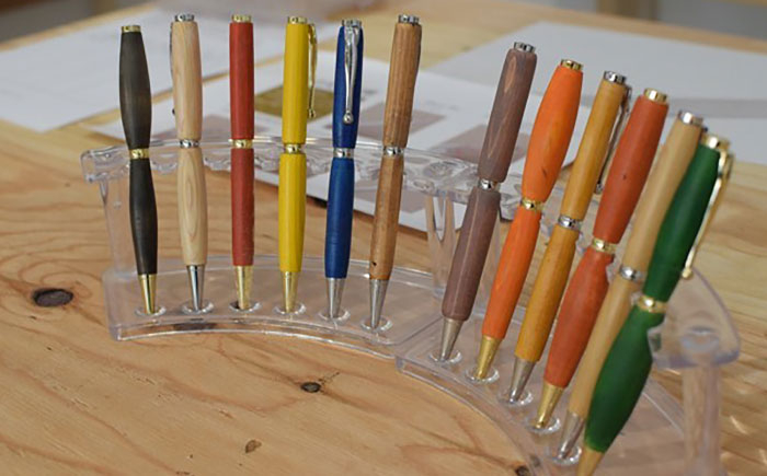 作りたいボールペンの形をサンプルから選んで、握るところの形を自分で削って世界にたったひとつの木のボールペンをつくる体験ができます。