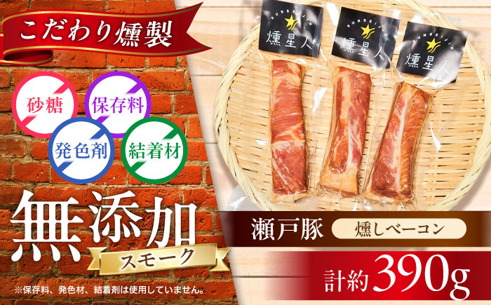 添加物不使用。国産肉、塩、胡椒のみで燻製。素材の美味しさ・脂の旨味・燻した薫り 燻しベーコン 3袋 / 燻製 豚肉 スモーク おつまみ / 瀬戸市 / 天佑 [BBBZ008]