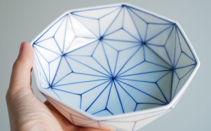 赤ちゃんの成長と厄除け、魔除けの意味も持つ縁起の良い日本の伝統の麻の葉模様を、八角形のうつわに大胆に描きました。