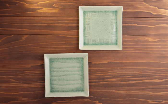 瀬戸焼テーブルコーディネートコンテストで入賞!ガラス質の透き通る色彩! 【瀬戸焼】灰釉7寸正角皿 波紋&市松セット(化粧箱入り) 【合資会社 鐘忠陶器】/ 陶器 皿 食器 / 瀬戸市 [BBDG001]