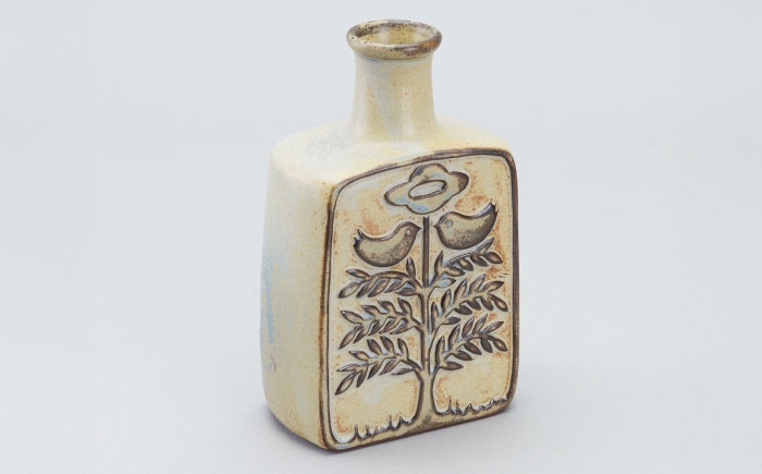 職人が一点ずつ手がけた花器は、表面に鳥と草花、裏面に幾何学模様が施されたリバーシブル仕様。