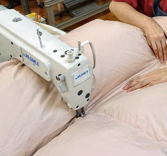 自社工房の職人達が豊富な加工方法で対応します。羽毛の「かさ高」に合わせてハイマチ加工や二層式立体キルト加工で縫製することで羽毛の特性である保温性をアップさせます