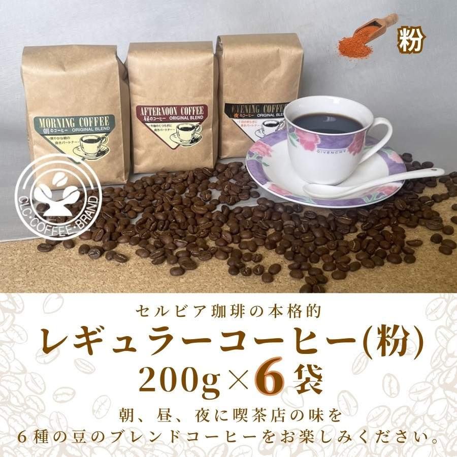 朝、昼、夜に喫茶店の味を、、6種の豆をブレンドしています。 【レギュラーコーヒー(粉)】セルビア珈琲の本格的なコーヒー豆の詰め合せ。 200g×6クラフト袋入