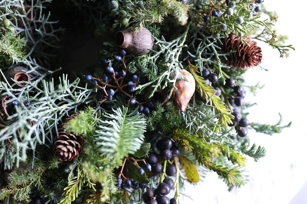 針葉樹や実物などを花束のように束ねXmasに楽しんで頂ける限定スワッグです。
