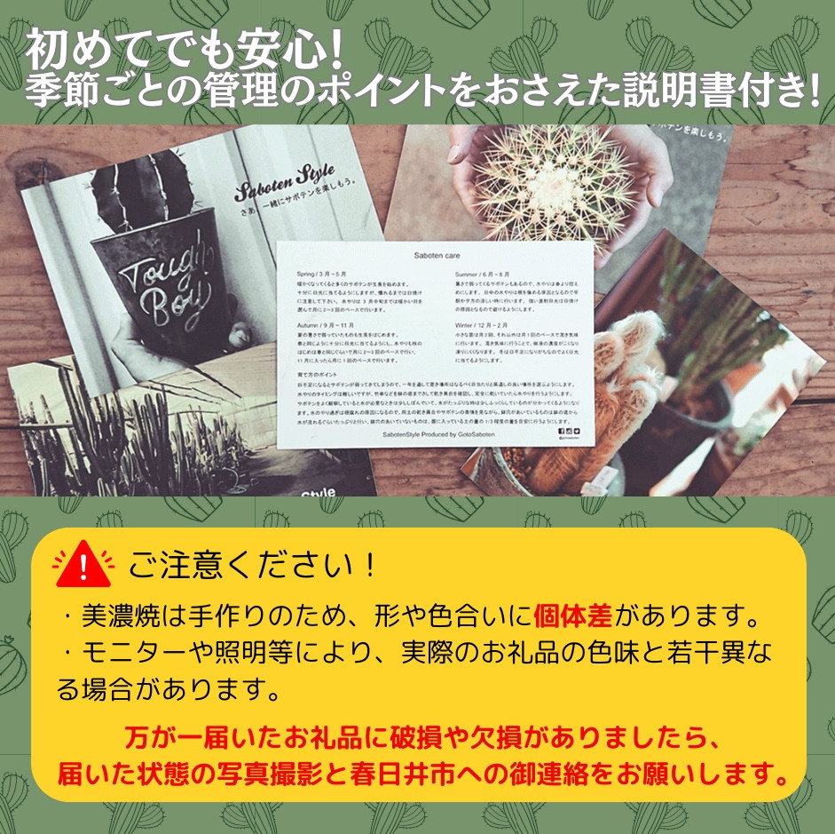 | 容量 | 植木鉢:多治見市産 サボテン:春日井市産 ビン・ワレモノ ■鉢 サイズ:径9.2×高12cm ※手作りのため大きさには個体差があります。 ■サボテン ※植え込みのサボテンは季節ごとのセレクトとなりますので画像と異なる場合がございます。 |
