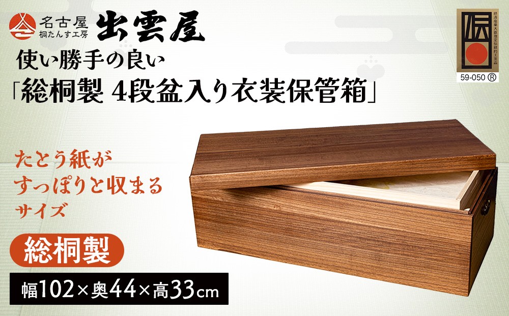 【限定品】 気密性の高い本格的衣装箱!4段盆入り。 使い勝手の良い「総桐製 4段盆入り衣装保管箱」