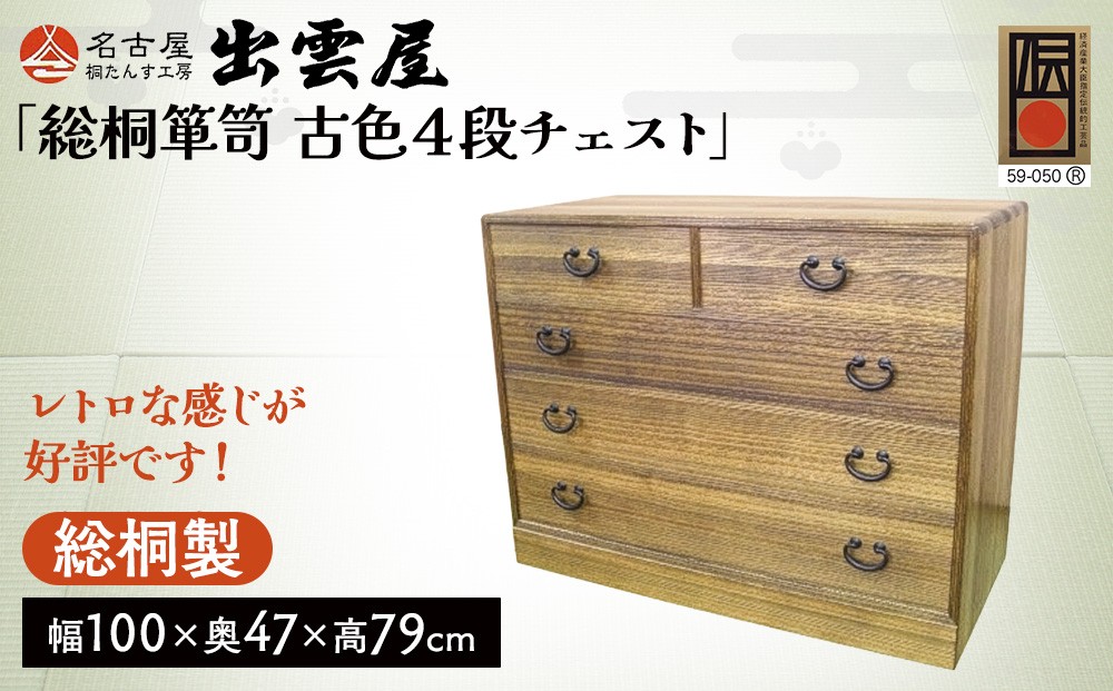 | 容量 | 総桐箪笥 古色4段チェスト 1棹 本体サイズ:幅100×奥47×高79cm |