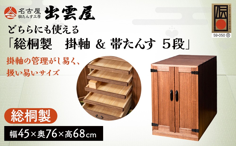 | 容量 | 総桐製 掛軸 & 帯たんす 5段 1棹 本体サイズ:幅45×奥76×高68cm |