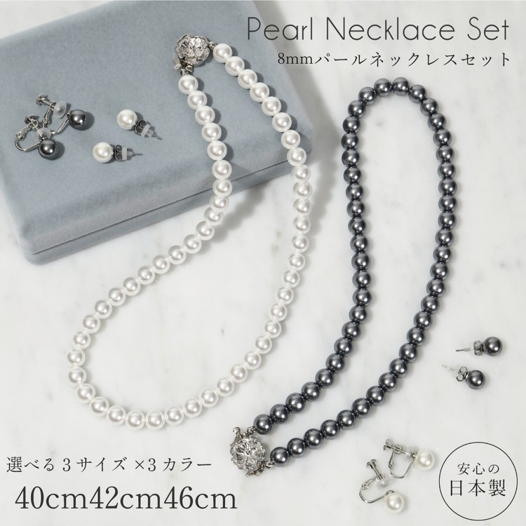 大人の女性のマストアイテム 冠婚葬祭、華やかなシーンに パールジュエリーセット 8mm貝パールネックレス 選べる色・サイズ・イヤリングピアス