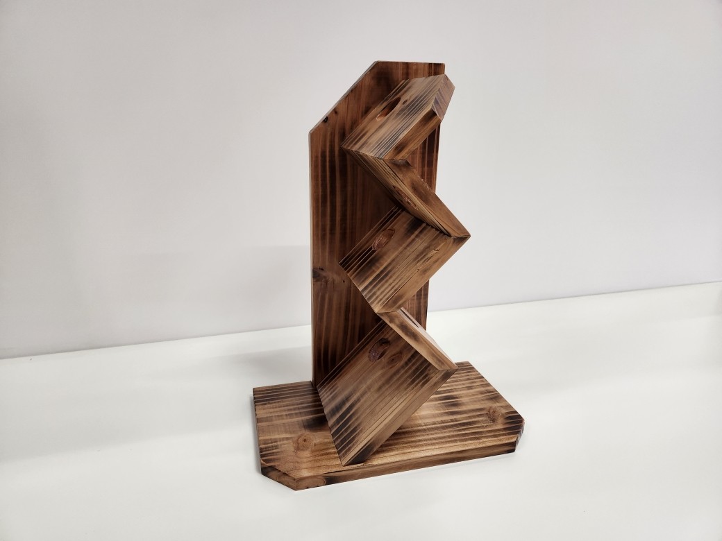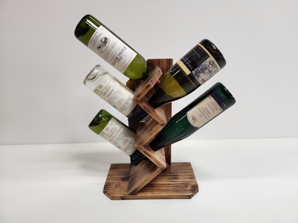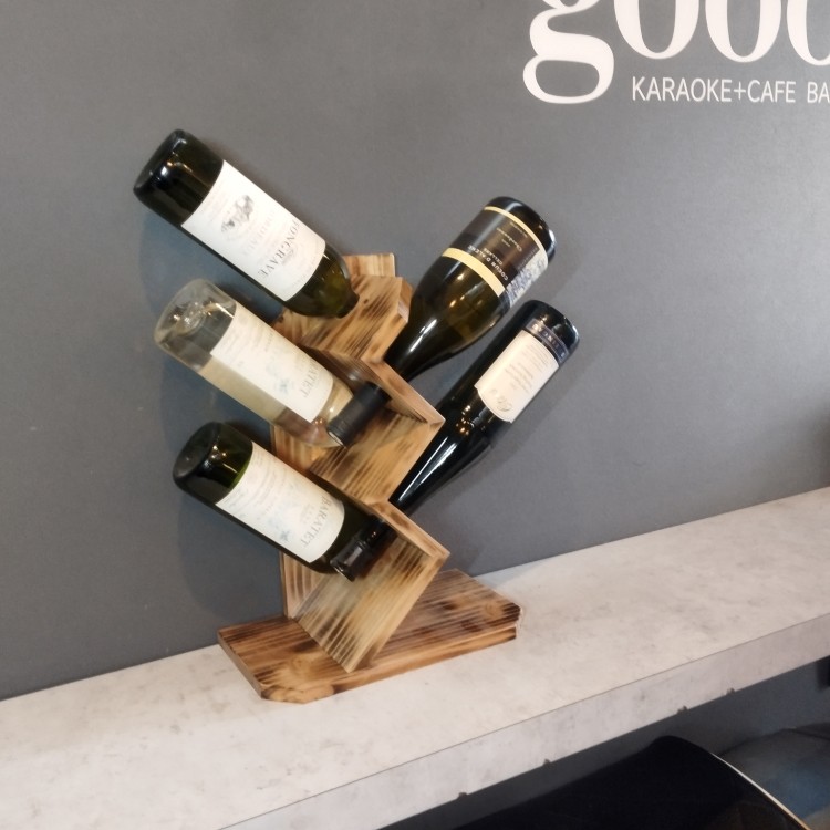 社長がおしゃれな洋風レストランのカウンターに置かれているイメージでデザイン・制作 木製ワインラック ~波状型スタンド~(5本立て型)