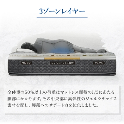 さらに25度~35度の温度調節機能を持ったジェルラテックスは、寝床内からの熱を吸収・分散させ、快適な睡眠環境をお届けします。