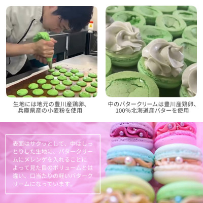 豊川市で行っている製造加工工程:原材料・梱包材料の仕入れ、マカロン生地の製造、マカロン生地の焼成、バタークリームの製造、マカロン生地へのバタークリームの絞りとサンド、アラザンの飾りつけ、梱包、冷凍保存、冷凍発送