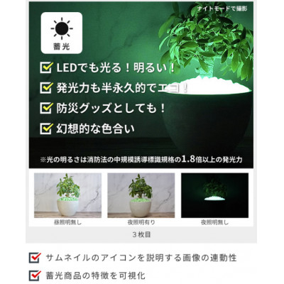 ポイント2 発光時の色合いも全てのカラーで異なり、幻想的な色合いでお庭を彩ります