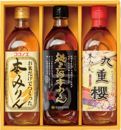 | 容量 | 純三河本みりん500ml×1本、本みりん九重櫻500ml×1本、お米だけでつくった本みりん500ml×1本 |