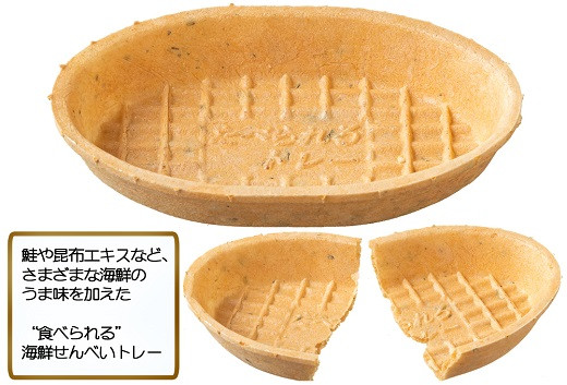 トレーは鮭や昆布エキスなど、さまざまな海産物のうま味を加えた海鮮せんべいでできていますので最後の最後まで食べきることができるエコに配慮したおせんべいです。