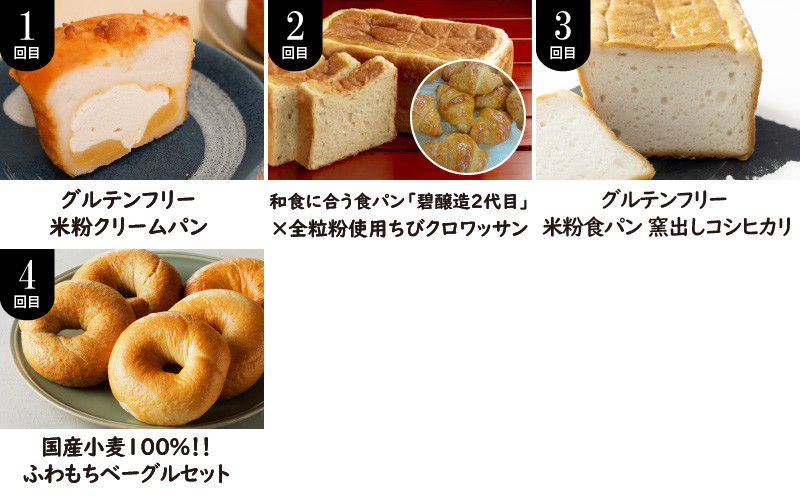 | 容量 | 【1回目】グルテンフリー 米粉クリームパン 【2回目】和食に合う食パン「碧醸造2代目」×2本&全粒粉使用ちびクロワッサン10個 【3回目】グルテンフリー 米粉食パン 窯出しコシヒカリ 2本 【4回目】国産小麦100%!!ふわもちベーグルセット |