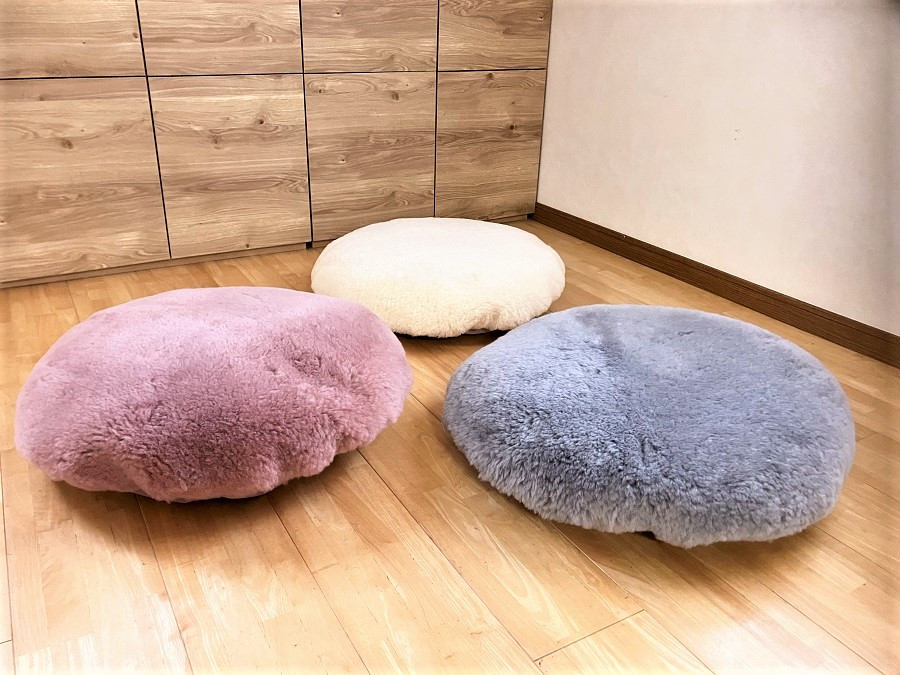ムートン独特の滑らかで心地よい触感があります。 無数の毛が体を支えるため、長時間同じ場所にいても血流が妨げられにくいです。 また、ある程度の水ははじき、汚れがつきにくいのもムートンの特徴です。