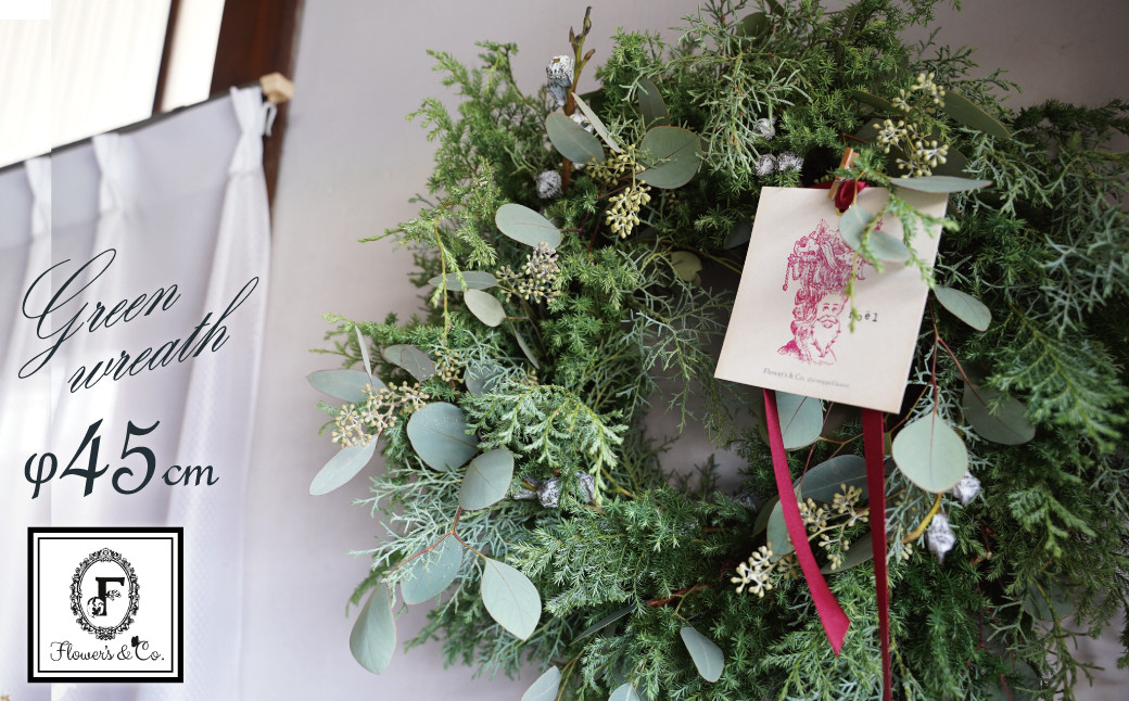 シンプルで洗練されたエバーグリーンのみで作りあげる存在感のある大きなリースです。王道のリースながらも、いろいろなテクスチャーの葉を使用しており飽きることがありません。