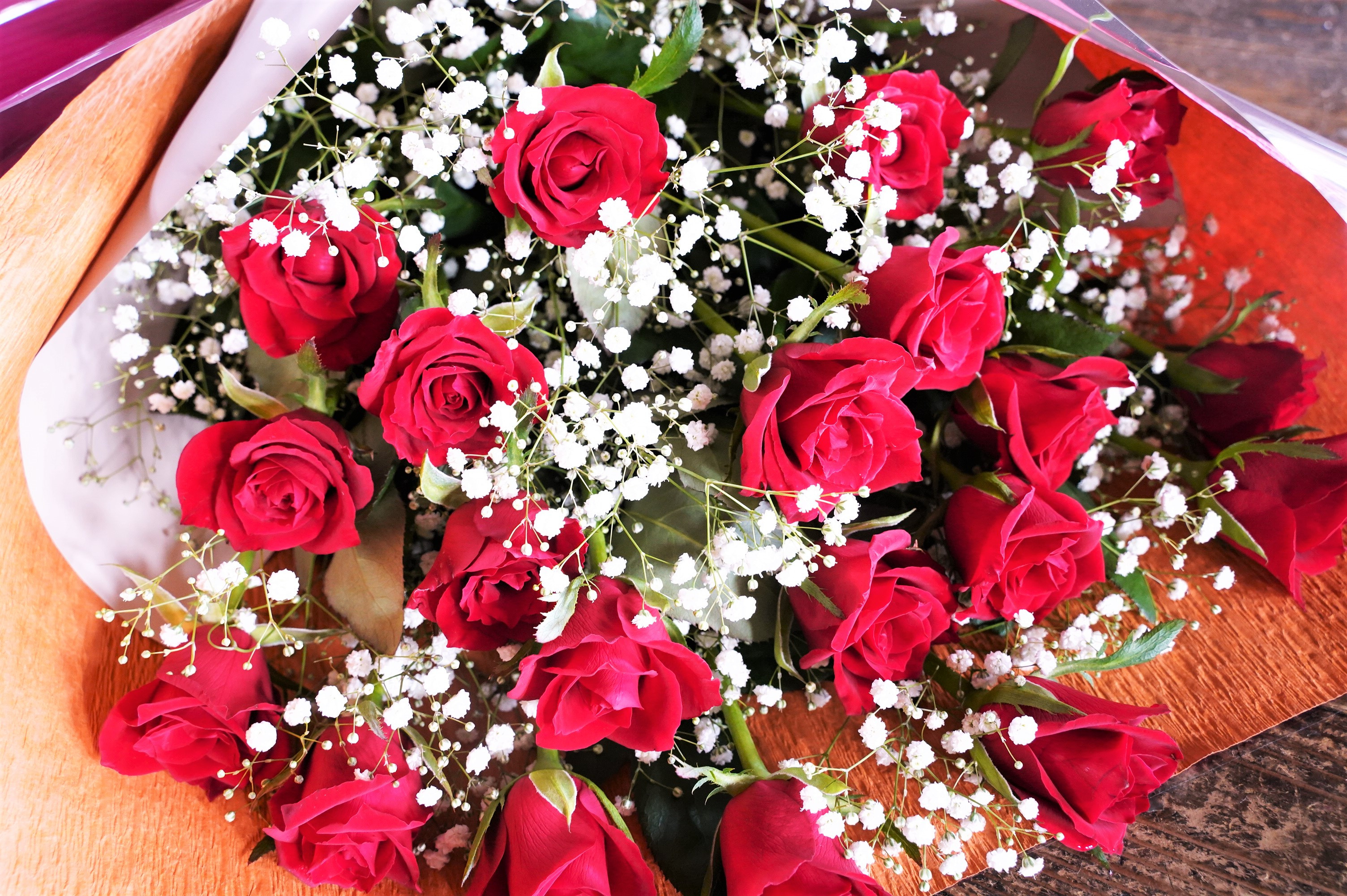 碧南市で大切に育てられた赤バラをカスミソウと組み合わせて花束にし、お届けします。