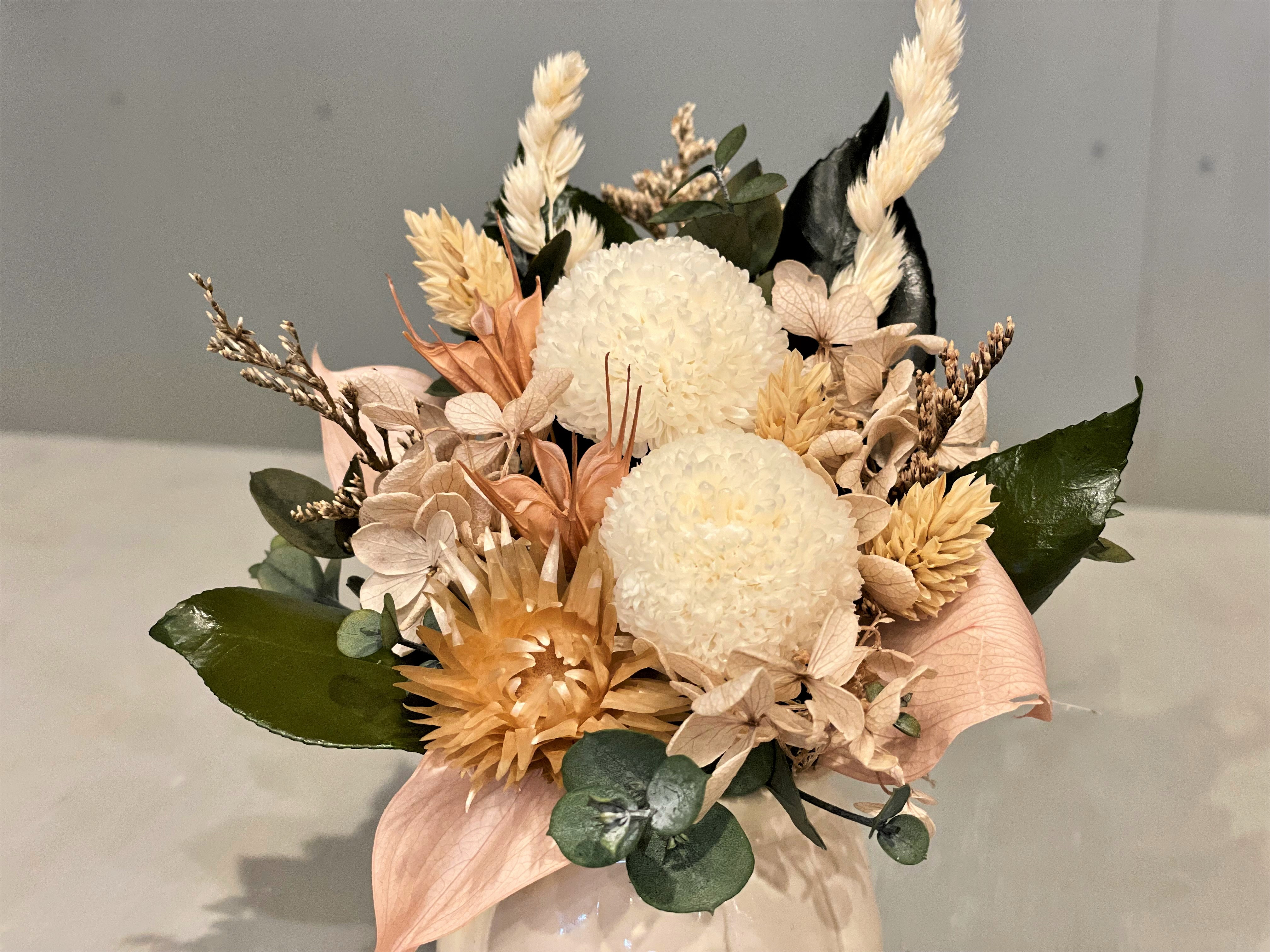 プリザーブドフラワーとドライフラワーを使ったインテリア。長期楽しんでいただけます