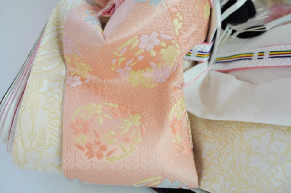女雛のお袖の中の五枚重ねの衣の事で、重ねの色目は四季を表します。