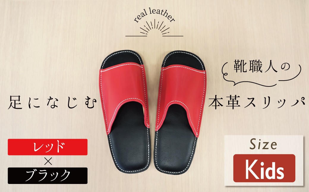 贅沢にもインソールまで高級本革使用!夏は蒸れずに涼しく、冬は暖かいレザースリッパ 靴職人手作りの本革「スリッパ」 レッド×ブラック キッズサイズ ルームシューズ 部屋履き 雑貨 日用品 革 本革 高級 ギフト プレゼント 贈答 赤 黒 災害 子ども H066-061