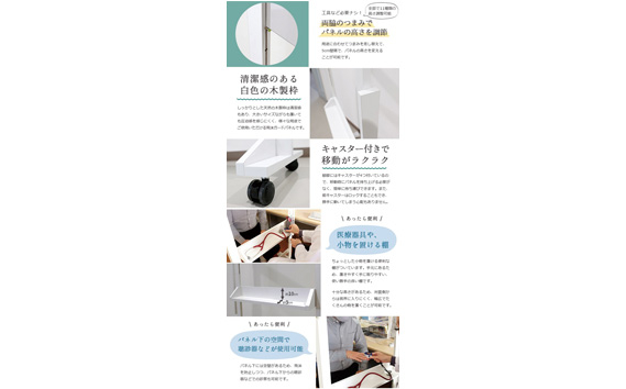 | 容量 | 設置寸法:約幅75×高さ156×奥行40cm フレーム色:ホワイト パネル:約厚さ0.2×幅66×高さ50cm パネル材質:塩ビ フレーム材質:木製、抗ウイルスポリエステル化粧板 組立品です。ドライバーによるビスもみ、もしくはダボ組み等が必要です。 ■返礼品の初期不良について 商品到着後速やかに中身を確認してください。 破損がある場合にはすぐにご連絡をお願いします。 一定期間が経過してからの部品交換等のお申出は有償となりますのでご注意ください。 ※画像はイメージです。 ※お届けに際し時間帯の指定はご容赦ください。 ※お届けは島嶼部を除き、北海道・本州・四国・九州(沖縄除く)に限らせていただきます。 |
