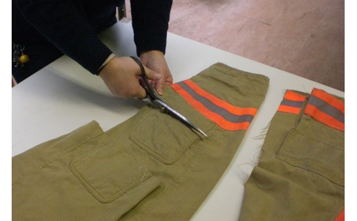 私たちは「豊田市消防本部」より耐久年数の過ぎた防火衣を譲り受け、「トートバッグ」として新たな活躍の場を設けました。防火衣はとにかく丈夫です。バッグにリメイクするには、洗浄・乾燥の工程を経て裁断・一枚布になるよう大半の糸をほどいていきます。切ったりほどいたりするだけでも力仕事のように体力を使い、それだけ防火衣は頑丈にできているのだと改めて感じます。そしてこれらの工程が終わるとようやく生地を組み合わせて縫製を行っていきます。防火衣についているオレンジの反射材(リフレクター)もい一旦は取り外しますが、製品に合わせて防火衣の雰囲気を保てるよう再度取付けます。使用されていたものになるのでひとつひとつ異なる風合いやキズ・汚れもありますが、これこそ「活躍の証」という味わい深さになっています。防水性にも長けた製品で当施設の自慢の消防ホースバッグ同様、世界にひとつの「あなただけの一点もの」です。