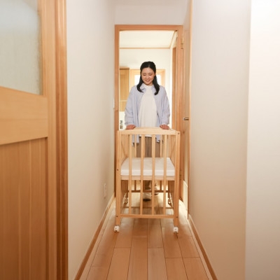 リビングコットなら、ママやパパがリビングやキッチンでお仕事している間も、いつでもすぐそばで見守れるコンパクトなベビーベッドです。