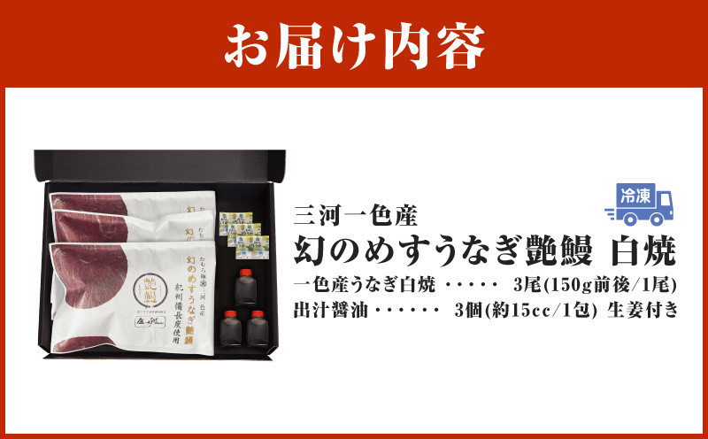 | 容量 | 一色産うなぎ白焼3尾(150g前後/1尾) 生産地:愛知県西尾市 出汁醤油3個(約15cc/1包)、生姜付き 製造地:岐阜県各務原市 |