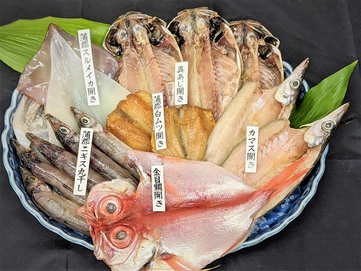 | 容量 | 【内容】 蒲郡スルメイカ1枚・三河湾かます開き2枚・蒲郡ニギス丸干し5本・とろあじ開き3枚・金目鯛干物1枚・蒲郡白むつ味醂干し2枚 ※漁の状況によって内容が変更となる場合があります※ 【原材料】 するめいか・かます・にぎす・あじ・金目鯛・白むつ など |
