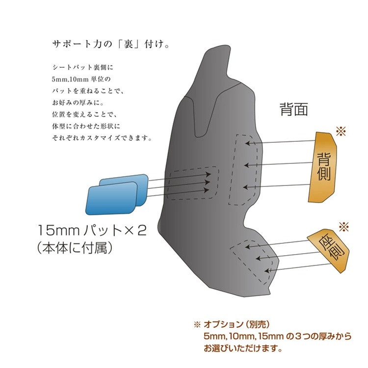 腰から頭部までを幅広くホールド!! 背面に専用のウエストパットを貼り付けることで 着座環境を細かくカスタマイズする事もできます。 帰省ラッシュ・Uターンラッシュの渋滞など長時間のドライブにもおすすめです!!
