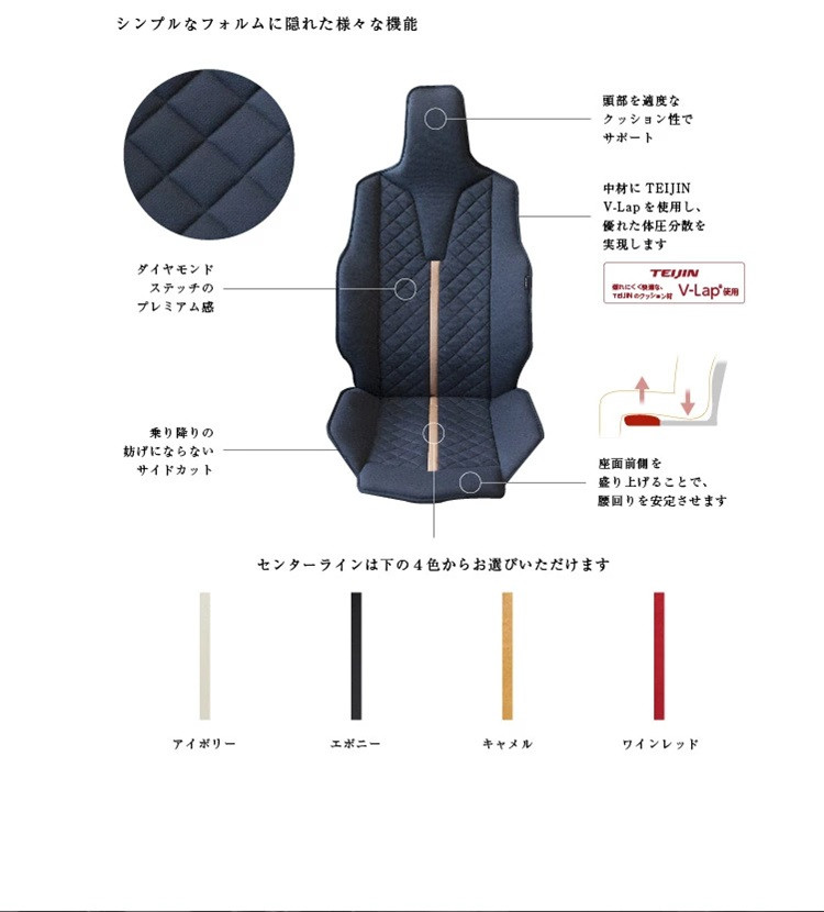 運転席が操縦席に! 車との一体感を高めて楽しいドライブを! ダイヤモンドキルトとセンターラインでスペシャリティな車内空間を! 体型、好みに合わせオーダーメード的にあなただけのポジションをお選びいただける、 新時代のドライビングサポートギアです。