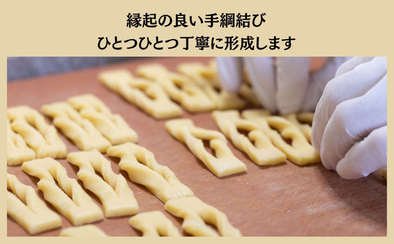 伝統的な "手綱結び(たづなむすび) の形には「良縁を結ぶ」という意味がありとても縁起のよいお菓子です。