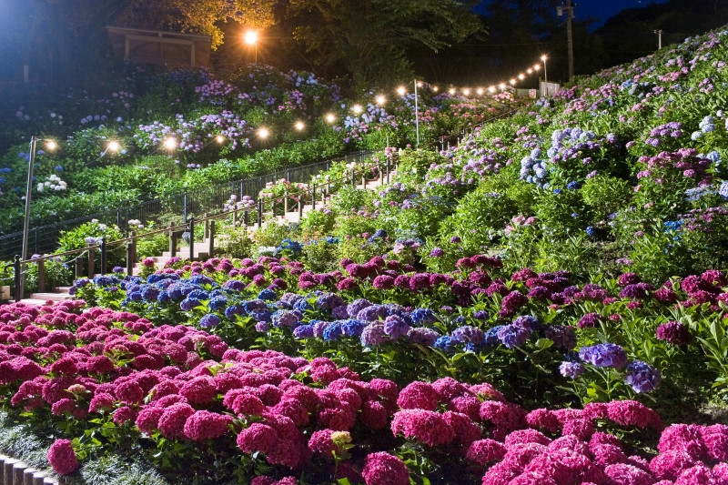 夜間はライトアップされ、昼間と違った風情でお楽しみでき、運が良ければあじさいの里に住むゲンジボタルを見ることもできます。