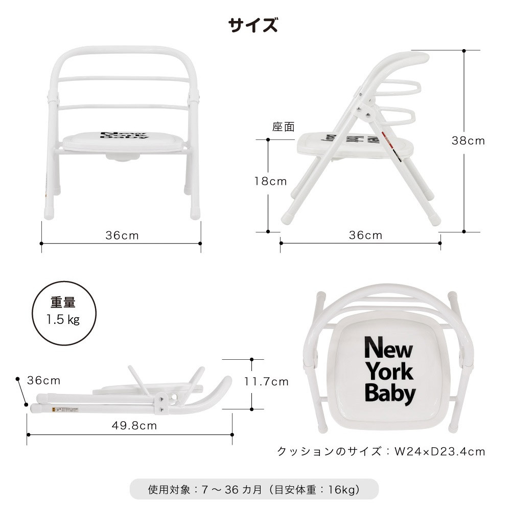 | 容量 | 【色】ブラック 【使用対象】 7ヶ月~36ヶ月(目安として体重16kgまで) 【本体サイズ】 幅36×奥行36×高さ38cm (折りたたみサイズ)幅36×奥行11.7×高さ49.8cm ・ 座面の高さ:床から約18cm ・ クッションサイズ:幅24×奥行23.4cm 【重量】 約1.5kg 【原材料】 フレーム:スチール クッション生地:PVC クッション中綿:EVAスポンジ 樹脂パーツ:・足:LDPE(軟質ポリエチレン)・折り畳み可動部:PP・座面枠:PP |