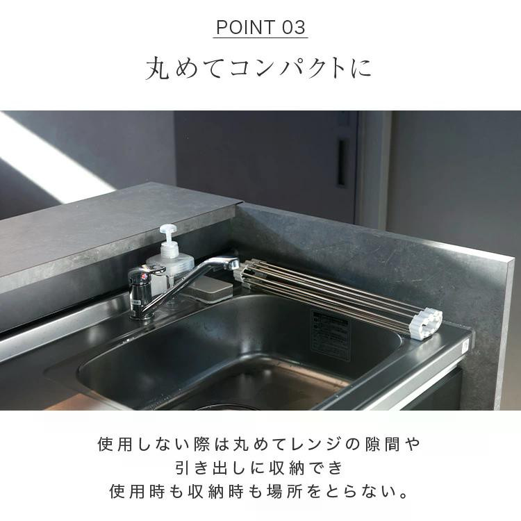 錆びやカビに強い素材を採用しており、使わない時は丸めて隙間や引き出しに収納できて場所をとりません。
