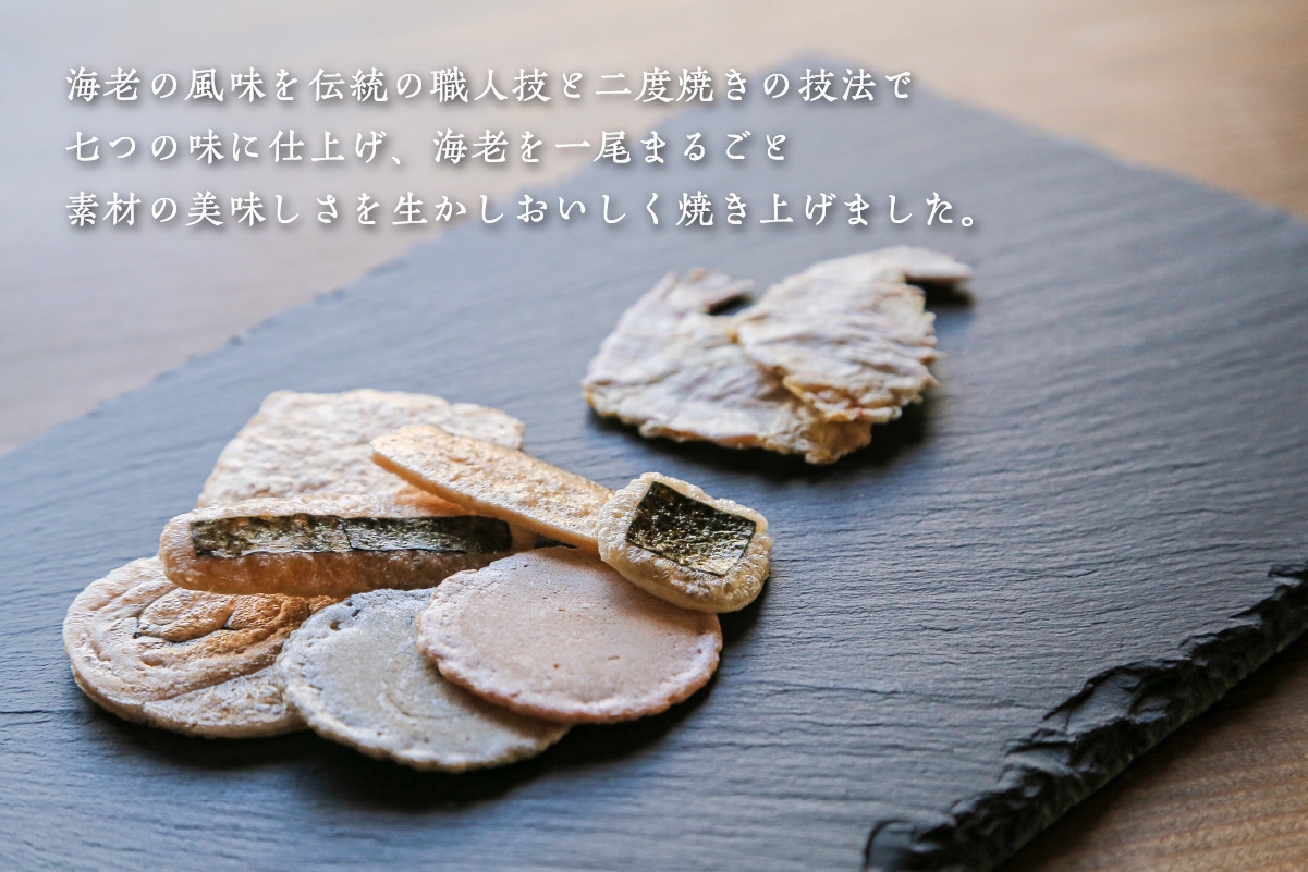 海老の風味を伝統の職人技と二度焼の技法で丹念に仕上げました。海老を1尾まるごと、素材のおいしさを生かした「本えび焼」…。贅沢にまとめた磯の香りをぜひお楽しみください。