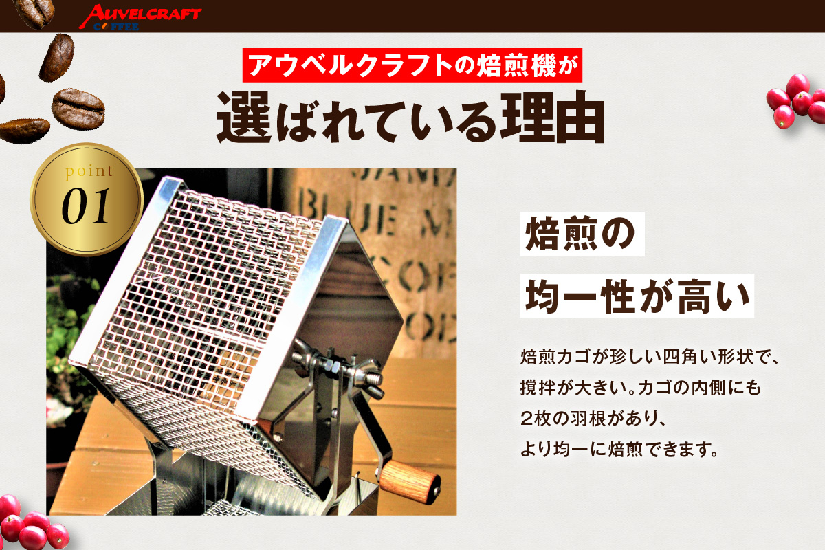 ・焙煎カゴが世界でも珍しい四角い形状のため、円柱状の物と比べて豆の撹拌が大きくなります。