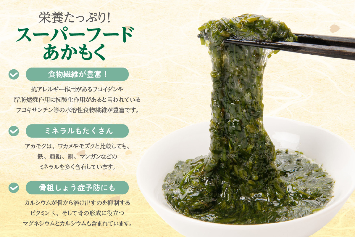 ホンダワラ科に属する天然海藻「あかもく」は、特有の粘り気があり、高血圧の抑制やコレステロールの低下に効果が期待される「フコイダン」、「アルギン酸」、さらに「ビタミンK」を豊富に含んでいます。