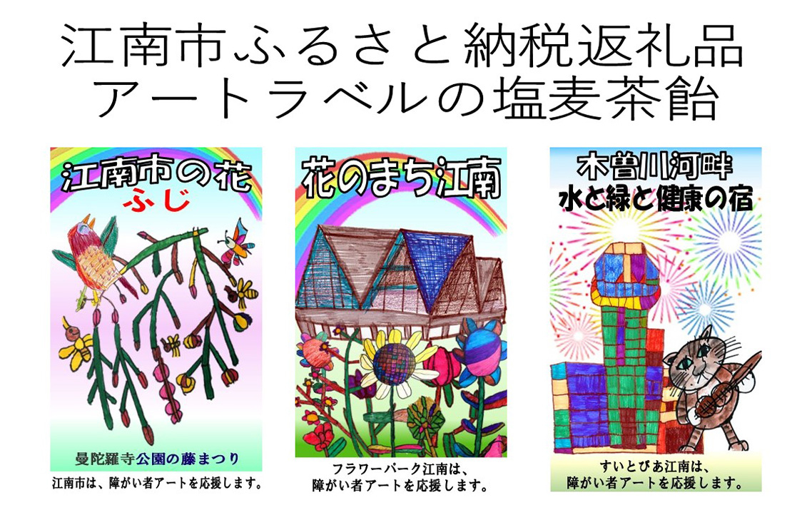 江南市の花や施設を障がい者が描き、ボランティア団体笑夢がラベルにしています。
